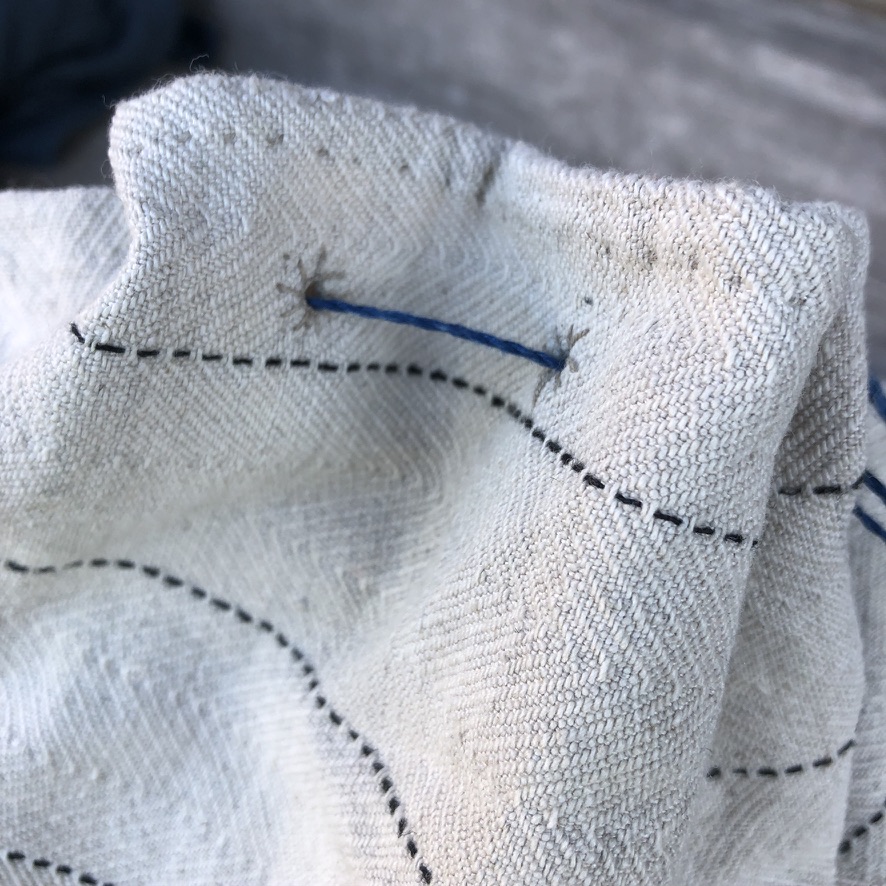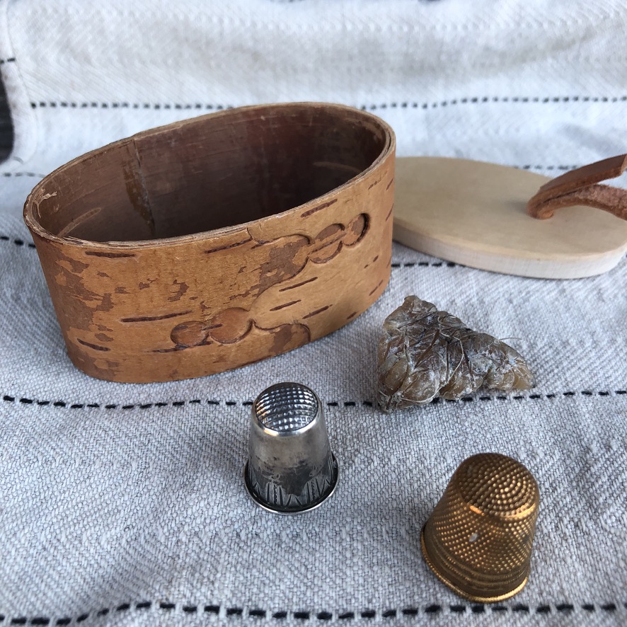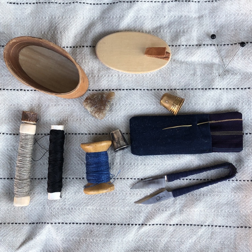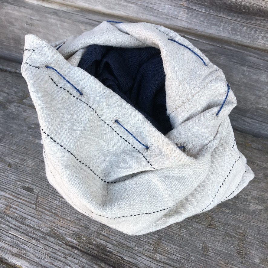 Sybehören som jag använde, var en handgjord synål i mässing, tre knappnålar (från början var det tre handgjorda knappnålar i mässing, men tyvärr tappade jag dem, en efter en), en liten sax, handspunnen oblekt lintråd, indigofärgad och svart lintråd, vax samt två fingerborgar.