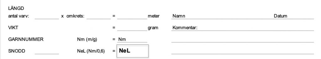 Bäst är när garnet är i en garnhärva, då är det lätt att räkna ut hur många meter garn du har och sedan väga härvan. Beräkna Nm numret (m/g) för att sedan med hjälp av omräkningstalet 0,6 och beräkna linnumret NeL.