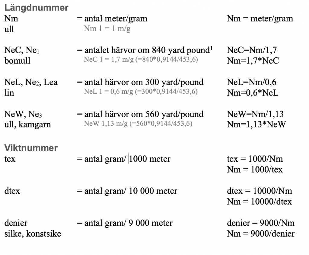 Det finns också Nf, French count (antal kilometer garn/0,5 kg), den är ovanlig idag