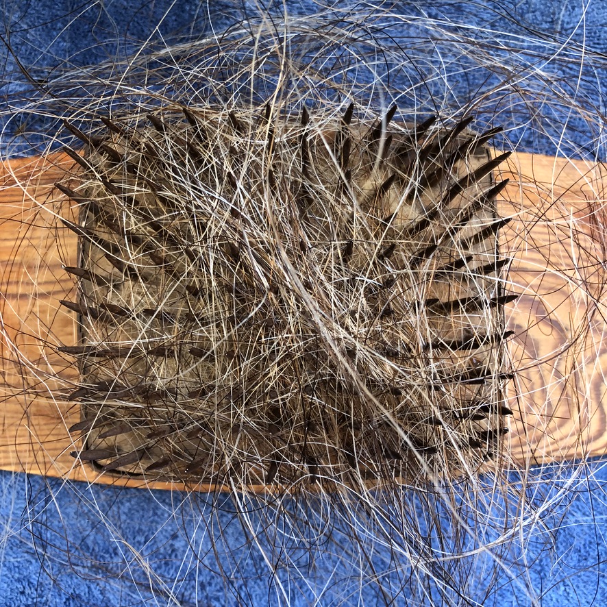 Jag har bara haft en bunt med tagel som jag har tvättat. Den bunten tvättade jag enligt denna beskrivning. Sedan tog jag en häckla och häcklade bort de kortare fibrerna. Dessa bilder kommer från när jag häcklade fibrerna efter denna tvätt. Det långa taglet som blev kvar snörde jag ihop till en bunt.